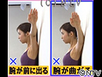 ① 基本編と同じように、肩と肘を水平にあげます。 ② 肩甲骨を持ち上げ、5秒かけて回しながらおろします。 この時は、肩甲骨周りの筋肉をはがすイメージで、 上から下に筋肉を絞り込みます。 これも3回行ってください。 肩甲骨をよせる動きをすることで、 首から背中にかけて、 筋肉の深い部分からほぐしているのです。