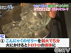 市販のこんにゃくのゼリーを、 鍋に入れて弱火で5分かけます。 形がなくなり、ドロドロの液体になったら リンゴやパイナップルなどのフルーツを ゼリーにくぐらせ氷水につけるだけで 完成です。