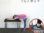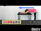 テーブルに両手をのせ、軽く体重を支えます。 そのまま両腕を前にスーッと伸ばして、 ここで30秒間止めます。 この時、かかとが浮かないように気をつけて、 体を直角に曲げて手を伸ばします。 肩から背中・ももの裏をつなぐ筋膜が伸びます。 ここは大きな筋肉が集中していて、 動かしやすくすることで、 代謝がアップするのです。 3回を1セットにして、1日3セット行いましょう。