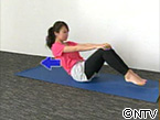 床に座り両手をひざにのせ、 ひじを伸ばします。 体重を後ろへ移動させ、 肩が床につきそうになったら前に体重を移動させます。 両足を床につけず、また後ろに体重を移動。 前に後ろに、ゆりかごのように 繰り返します。 ひじが曲がったり、ひざが伸びないように 注意して下さい。 腹直筋と大殿筋を同時に鍛えられます。 5往復を1セットにして、1日に3セット行い、 慣れてきたら回数を増やしましょう。