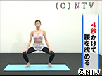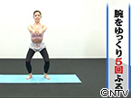 3、 腰を沈めたまま、まき割りをするように、 腕をゆっくり5回ふります。 腕は90度しっかりあげてください。 4、 最後は、3秒かけて元の体勢に戻ります。 息を止めてトレーニングするのは急激な 血圧の上昇などの危険があるため、 数を数えながらスクワットしてください。 これを1日10回3セット行います。 ※無理をせず自分のペースで行ってください。