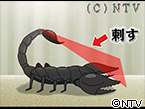 サソリは大きなハサミが危険と思われがちですが、 ハサミはそれほどではありません。 気をつけなければいけないのは、 毒のある尻尾の先端とハサミの間の三角ゾーンです。 尻尾は釣り針のように反っていて、 前にいるものを刺しやすい構造になっています。 ※持つときは、毒針に気をつけてください!