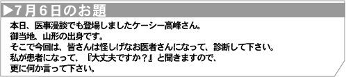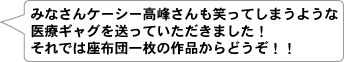 | かるがも さん 年齢:31〜40才 住所:山梨県 え〜っと、病名はいえませんね。 大丈夫ですかね? だから、さっきからいえん(胃炎)と言っているじゃないですか。 |