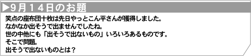 | しりゅう さん 出そうで出ないもの 急に雨が降ってきた時の、かばんの中の折り畳み傘。 |