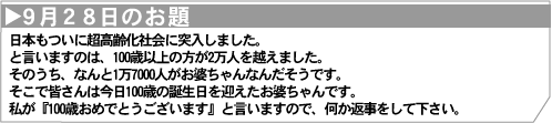 | 生徒会長 さん 100歳おめでとうございます あら、もうそんなに歳とったかしら。 最近ボケが激しくて。 |
