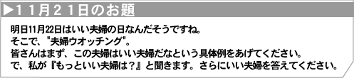 | 微風を呼ぶ男 さん 年齢:31〜40才 だんなさんが奥さんに決して手を上げないのがいい夫婦。 もっといい夫婦は? だんなさんが奥さんに頭も上がらない夫婦。 |