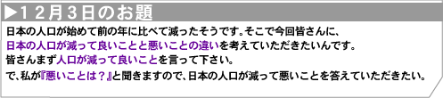 | 11 さん 人口が減って良いことは、 夏、涼しいことです。 悪いことは? 冬、寒いことです。 |