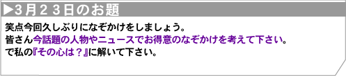 | 象の耳たぶ さん 日銀総裁選びとかけて、自動販売機で缶コーヒーを買った人ととく。 『その心は?』 無糖(武藤)を選んでみたが、甘くは無かった。 |