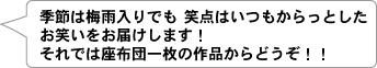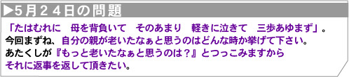 | 電門助七 さん 親が老いたなぁと思うとき。 家の庭に水をまいた後すぐにまた水をまいていたとき。 「もっと老いたなぁと思うのは?」 雨が降っているのに水をまいていたとき。 |