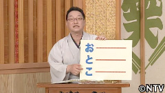 今回のメンバーはアナウンサー共に男ばかりの大喜利ということで男祭りですね。ということで「お と こ」をそれそれ頭にご自分や他のメンバーのことを紹介してください。笑点メンバーがやりたい時には、前の方が持っているフリップを借りてやってください。