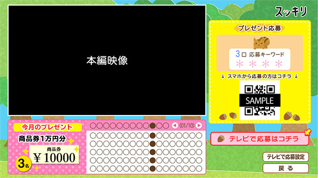 ※リモコンの色ボタンで選択後にテレビの電源OFFや、チャンネル選局などで、結果を確認していない場合はどんぐりが加算されません。ご注意ください。 - 1か月の期間中にどんぐりを【20PT】ためるとプレゼントに応募できます。