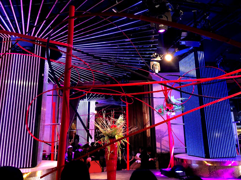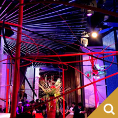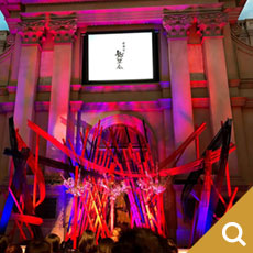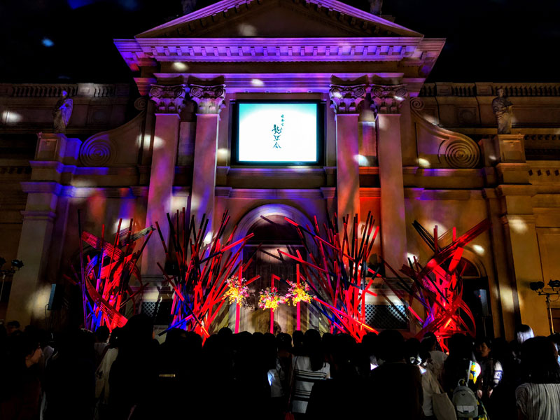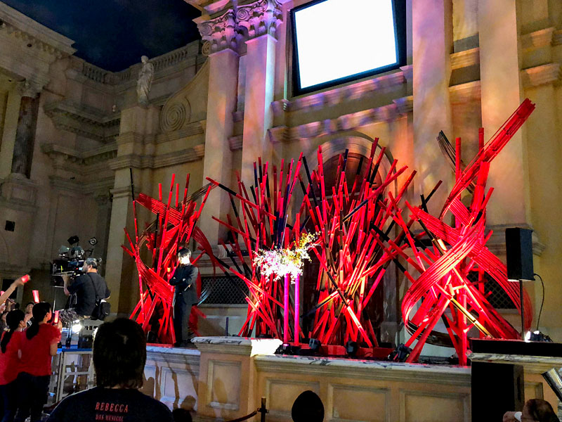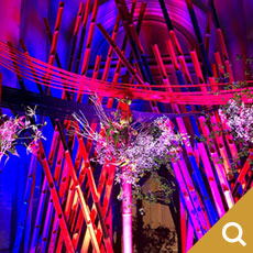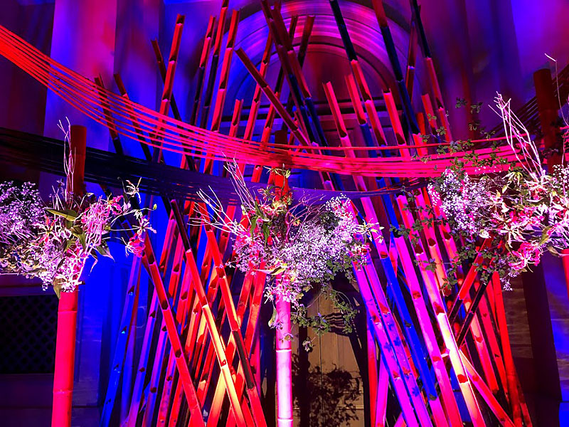 4メートルの竹を60本以上使用した巨大なインスタレーションを制作し、真ん中に3本立てた丸竹の中をくり抜いて花器のように仕立てました。そこにダンスパフォーマーたちが踊りながら花をいけていきます。