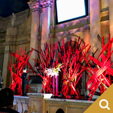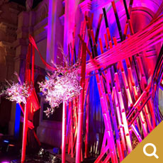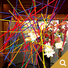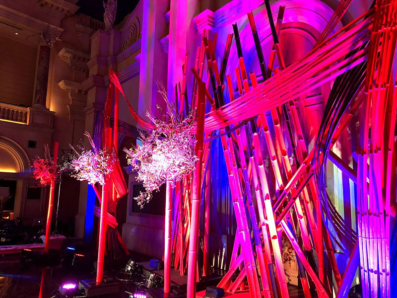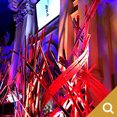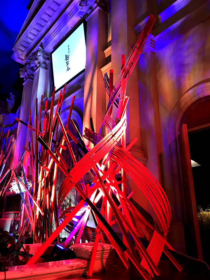 赤と黒に着色した竹のインスタレーションです。