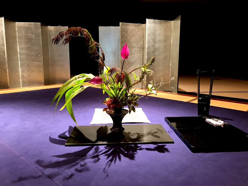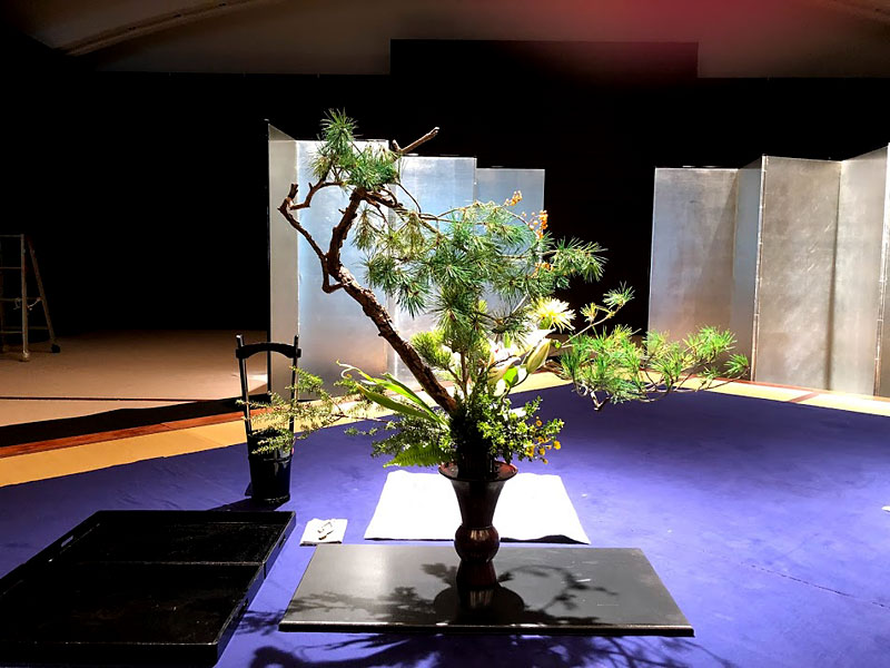 ダンサーと生け花と音楽、すべてのパフォーマンスが最大限に生かせるよう、入念にリハーサルが行われました。龍一の野望、虚栄心、情熱などを表現した総合芸術です。(大谷美香・草月流)