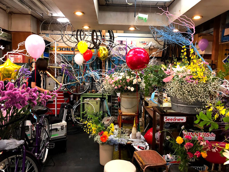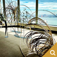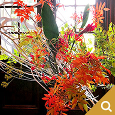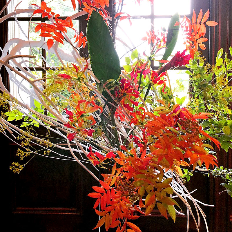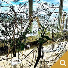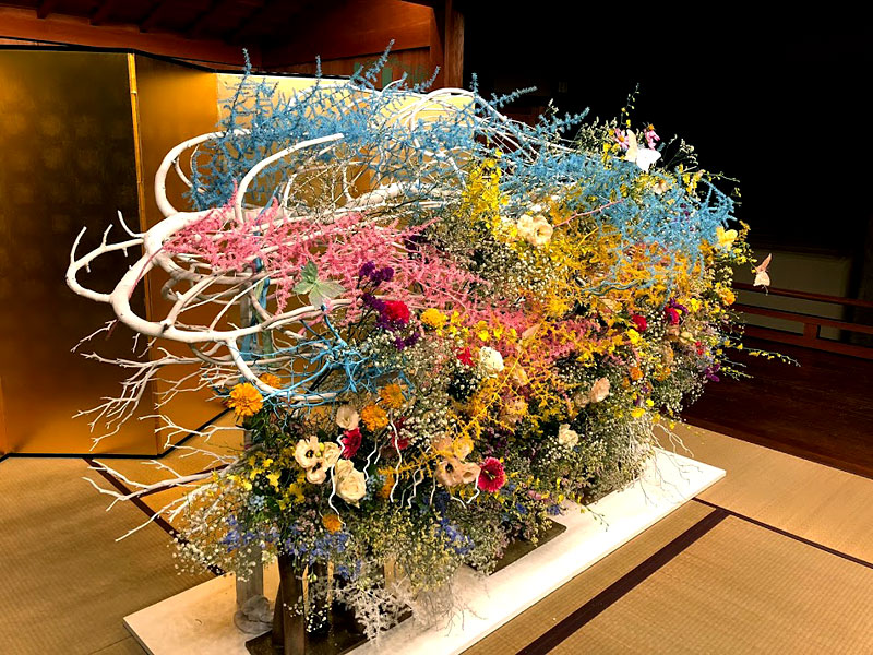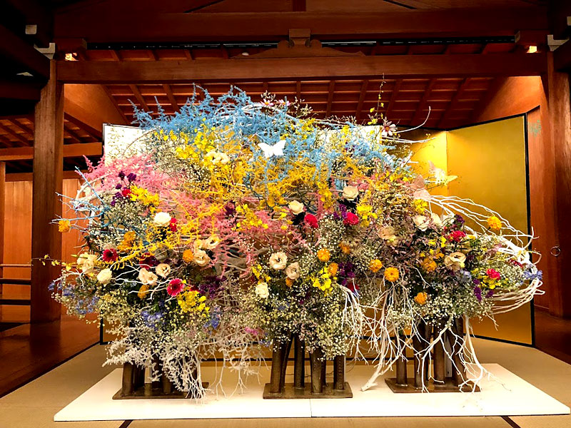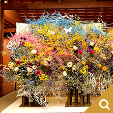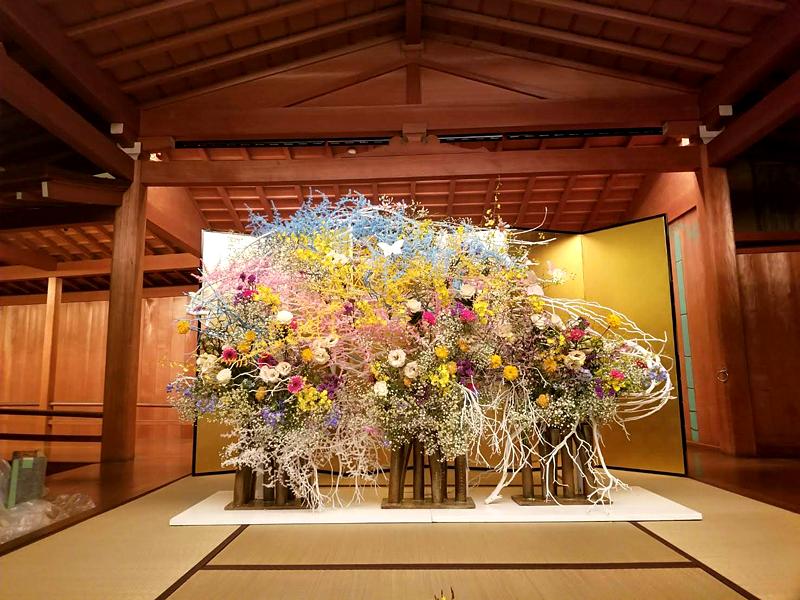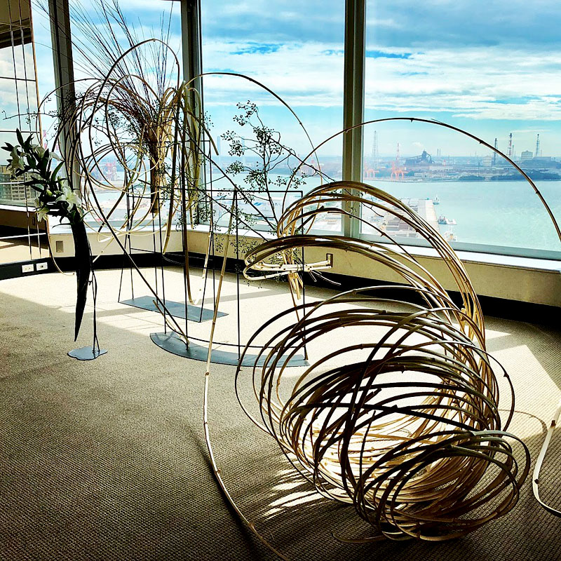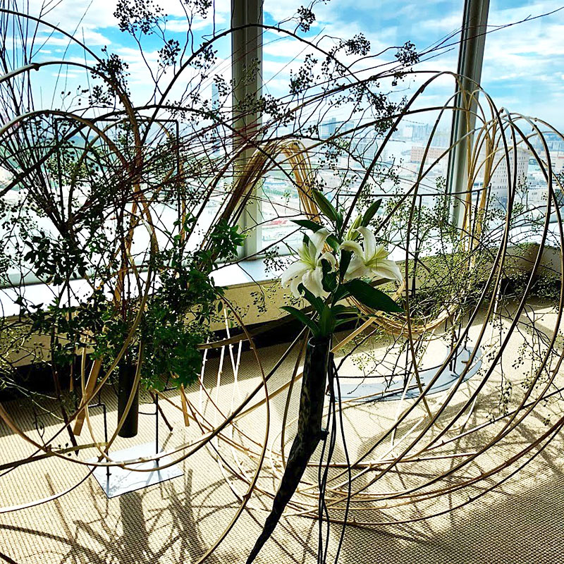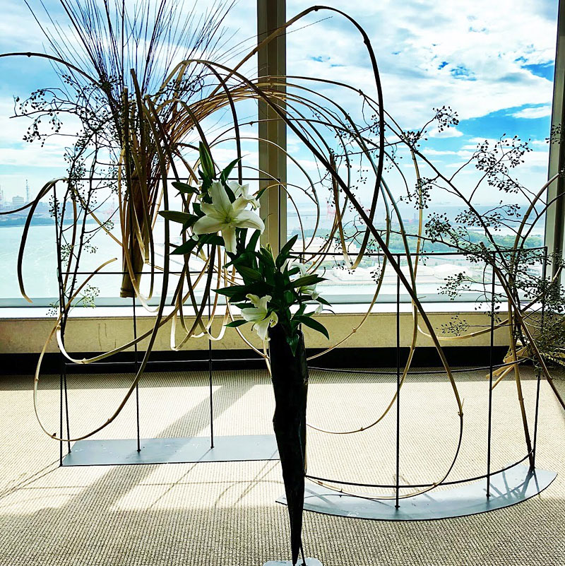 龍一を自分の駒として動かす市松の支配力を、周りを取り囲み龍一に迫る勢いの生け花で表現しました。空間に踊るような美しい曲線を描いているのは、割竹です。竹はそのままでは直線でしかありませんが、割ることによって、縦横無尽に線を描ける繊細にも大胆にもなる花材です。