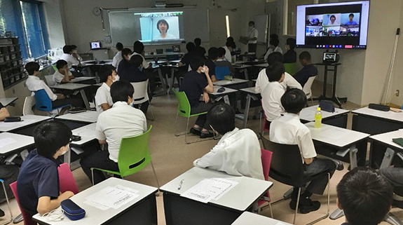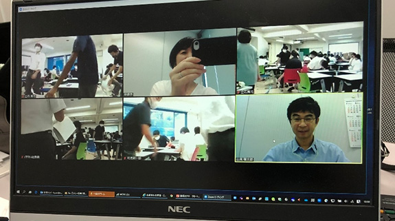 当日。対象は2年生。オンラインという、少し距離のある状態で、文字通り「手探り」でしたが、PCのモニター越しでも、生徒たちがうなずく様子などが見てとれます。そして時折、PCカメラの前でコミカルに体を揺らしてみたりする生徒の姿も・・・。