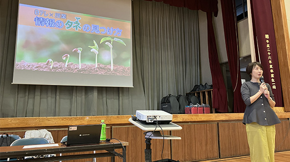 「情報のタネの見つけ方」は、中学校や高校で行われる調べ学習に、番組制作のノウハウを生かす趣旨で行っている出張授業プログラムですが、今回のように、職業体験の場として依頼を受けることも少なくありません。報道局での取材経験や企画制作のエピソードなども交えてお話しました。