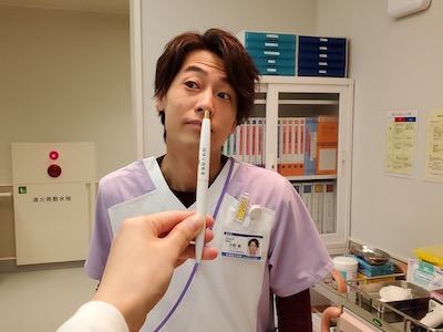 何やら、不思議そうな顔で覗き込む 看護師の犬飼さん。