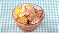 ズッキーニやパプリカなど夏野菜を加えて煮込み、冷蔵庫で60分冷やす