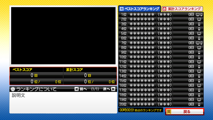 - お使いのテレビによっては、スコアが加算された直後にテレビの主電源を切る操作を行うと、正常にスコアが加算されない場合があります。主電源を切る場合は、スコアが加算されたのを確認した後、少し時間をおいていただくようお願い致します。