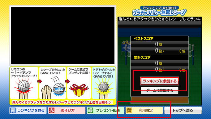 ①「グラチャンバレー無限レシーブ」画面から「ランキングに参加する」ボタンを押します。