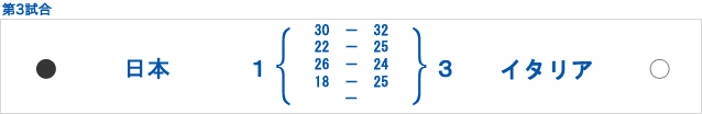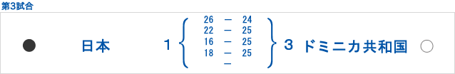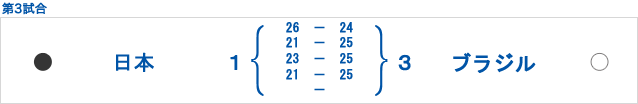 格上相手に日本は第1セットで、一時期、4対11と7点差つけられ厳しい戦いになりましたが、ここから粘りのバレーを展開。6連続ポイントなどで、ジュースに持込、結果26-24で先取します。しかし、第2、第3セットを接戦の末に21-25、23-25と落とすと、第4セットも続けて落とし、セットカウント1-3で大会初黒星を喫しました。日本は対ブラジル戦26連敗。