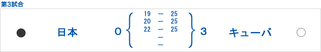第1セット、キャプテンのシモンの鋭いサーブと高いブロックにペースを奪われ19-25で奪われてしまいます。流れを変えたい日本ですが、キューバの高さと速さのある攻撃に対応できず本来のプレーが出来ません。結局第2セット、第3セットも落としセットカウント0-3で今大会初黒星を喫しました。