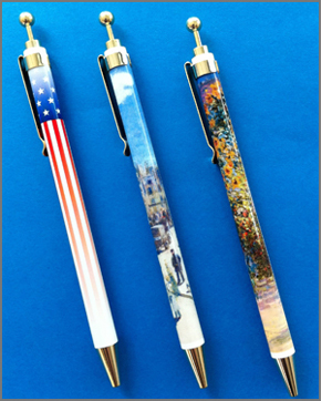 出品作品やアメリカの星条旗をあしらった、オリジナルのボールペンです。
