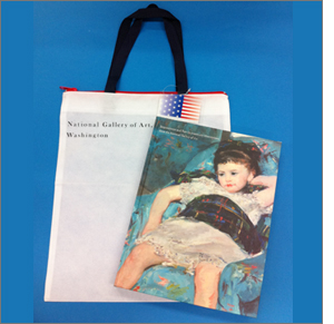 展覧会カタログも入れられるサイズのロゴバッグです。ワシントン・ナショナル・ギャラリー展のロゴをあしらったシンプルなデザインながら、手提げ部分の「紺色」とファスナー部分の「赤色」との組み合わせがとても印象的な不織布のバッグです。展覧会カタログとセットで是非お求めください。