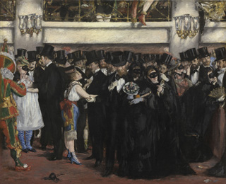 本作は、パリのオペラ座で毎年開催された有名な仮面舞踏会を描いたものです。仮装した高級娼婦たちの相手をしているのは、礼装に身を包んだ上流階級の紳士たちです。黒装束の人物を意図的に並置したため、その色彩の印象が劇的に高まっていて、上方で水平に広がるバルコニーの白との対照が際立っています。前衛画家としてのマネは、同時代の社会や風俗といった近代生活を主題とした絵画にいち早く取り組み、印象派の画家たちがそれに続きました。