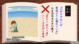 「奇特」とは『心がけや行いが普通よりも優れている』という意味で、 人をほめるときに使います。 だから『変な人・変わり者』といった否定的な意味合いで用いるのは 間違いなのです。 文化庁の調査では、正しい意味で理解している人はほぼ半数という結果が 出ているのでご注意を。
