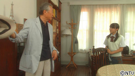 外は雨 出かける支度をしている教授 ことは『おじいちゃん、出かけるの?』 教 授『ああ。ちょっと駅前に本を買いにね』 ことは『あ!そういえば駅前に出る道、歩道が工事で狭くなってたよ 傘を差して通るときは危なさそうだから注意してね!』