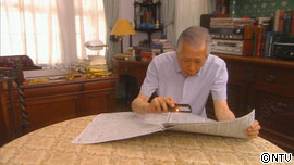 書斎で新聞を読んでいる教授 教授が突然くしゃみ! |