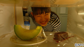 冷蔵庫を開けることは。中には水羊羹と果物が入っている 戻ってきたことは、手には水羊羹を持っている ことは「はい、水菓子お待たせ!」