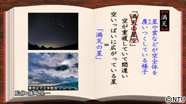 ことはが書斎で写真集を見ていると、 いろはがお茶セットを持って書斎に入ってくる。 いろは「あら、すごい綺麗な写真ね!」 ことは「これ図書室で借りてきたの。 世界のきれいな写真がいっぱい載ってるんだよ」 いろは「へー」 ことは「ほらこれ、満天の星空!行ってみたいなー」 いろはが突然くしゃみ! 『満天の星空』なぜ間違いなのでしょうか?