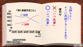気持ちよく、すぐに承諾することを表す慣用句は、 「一つ返事」ではなく「二つ返事」。 文化庁の調査では、20代から40代では「二つ返事」を 正しく使う割合が高く、50代以上では誤りの「一つ返事」を 使う人の割合が高くなっています。