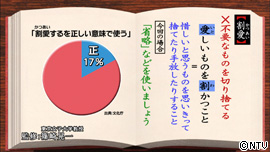 「割愛」は、「不要なものを切り捨てる」ことではなく、 漢字からも見てわかるように、 「愛(いと)」しいものを「割(わ)」かつこと。 つまり、「惜しいと思うもの」を、思いきって捨てたり、 手放したりすること。 文化庁の調査によると、正しく使うと答えたのは、 全体の17%しかいませんでした。 今回の場合、正しくは「省略」などを使いましょう。