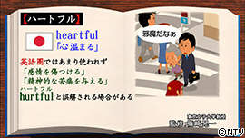 「ハートフル」は、日本で「心温まる」という意味で使われていますが、 アメリカなど英語圏ではあまり使われておらず、 「感情を傷つける・精神的な苦痛を与える」、「hurtful(ハートフル)」と 誤解される場合があります。 誤解を招かないように、「heartwarming(ハートウォーミング)」と 言いましょう。