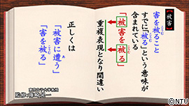 「被害」とは「害を被ること」で、 すでに「被る」という意味が含まれています。 なので、「被害を被る」というと、「被害」の「被」と、 「被る」が同じ意味で重なる重複表現となり間違いです。 正しくは「被害に遭う」「害を被る」と使いましょう。