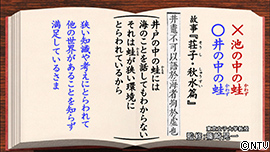 「池の中の蛙」ではなく「井の中の蛙」。 『荘子・秋水篇』の「井蛙不可以語於海、拘於虚也」(井戸の中の蛙には、海のことを話してもわからない。それは蛙が狭い環境にとらわれているからである)という故事に基づき、 「自分の狭い知識や考えにとらわれて、他の世界のあることを知らず満足しているさま」を言うときに使います。