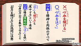 正しくは「心血を傾ける」ではなく、「心血を注ぐ」。 「心血」とは精神と肉体のすべて。 「注ぐ」も「傾ける」も「集中する」という意味ですが、 「心血」の場合は慣用的に「注ぐ」を使い、 「心身の力全てを集中させる」ことを表します。 「全力を傾ける」との混同に注意しましょう。