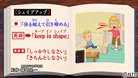 「シェイプ アップ」は、 日本で「体を鍛えて引き締める」という意味で使われていますが、 アメリカなど英語圏では、だらしない人に、 「しっかりしなさい」「きちんとしなさい」と言うときに使います。 英語では、「keep in shape」と言いましょう。