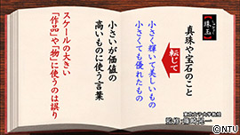 「珠玉」とは真珠や宝石のこと。 転じて、「小さく輝いて美しいもの」、「小さくても優れたもの」を指します。 「小さいが価値の高いもの」に使われる言葉ですので、 スケールの大きい「作品や物」に使うのは誤りです。
