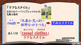 「ラフなスタイル」は日本で、 よくジーパンにTシャツのような気軽な格好を言いますが、 アメリカなど英語圏で、「rough(ラフ)」は 「乱暴な・荒っぽい・粗野な・がさつな」という意味なので、 下品なスタイルの意味にとらえられてしまいます。 英語で正しくは、「Casual clothes(カジュアル クロウズ)」と 言いましょう。
