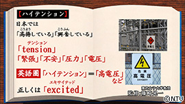 「ハイテンション」は、 日本では「高揚している・興奮している」という意味で使われていますが、英語の「tension」は、「緊張」や「不安」「圧力」「電圧」と言う意味。 したがって、アメリカなど英語圏で「ハイテンション」と言うと「高電圧」などと、とらえられてしまいます。 英語で正しくは、「excited(エキサイテッド)」と言いましょう。