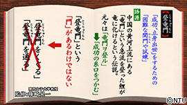 「登竜門」は「成功、立身出世」をするための 「困難な 関門や試練」という意味。 語源は、中国の黄河上流にある「竜門」という急流を登った鯉が 竜に化けるという伝説からきた言葉で、 もともとは「竜門ヲ登ル」で「成功の糸口をつかむ」という意味。 「登竜門」という「門」があるわけではないので、 「登竜門をくぐる」「登竜門を通る」は不適切。