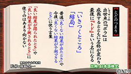 「とどのつまり」とは、 出世魚の「ボラ」は成長するとともに名称が変わり、最後に「トド」という名になるところから、「いきつくところ。結局。」という意味。 普通、良くない結果が出た時や、良くない結果が予測できるときに使う言葉なので、良い結果が得られた時や、良い結果が予測される時に使うのには、あまり向きません。