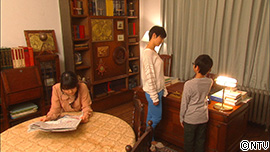 書斎で、文之介が父親と電話をしている。その後ろにいろは。 テーブルで、ことはが新聞を読んでいる。 文之介「パパが代わってだって」 いろは「はいもしもし、…ええ、すっかりコッチにも慣れたわよ。 心配しないで」 ことは「文之介君!」 ことは新聞の広告を見せ ことは「今日から新しいドラマ始まるみたい」 文之介「なんてドラマ?」 ことは「えーと、『弱くても勝てます~青志先生と へっぽこ高校球児の野望~』だって!」