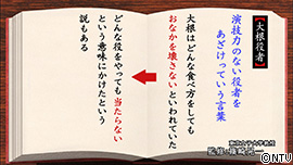 書斎で、ことはと、文之介が、劇の練習をしていると、 文之介「(…ん?大根役者?)ヘックション!」 『大根役者』とは、どういう意味なのでしょうか? |