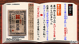 「能書き」とは、もともと薬の効能を記した「効能書き」の略。 昔の能書きには薬の効き目以上の大げさな言葉が並ぶものが 多かったため、次第に「能書き」は自分や物事のすぐれたことを 大げさにいうという意味に転じ、さらには「自己宣伝」を 表す言葉になりました。